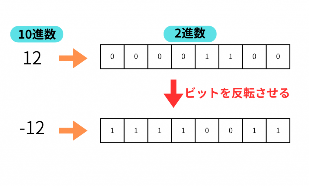 例として10進数「12」を1の補数表現にしてみましょう。