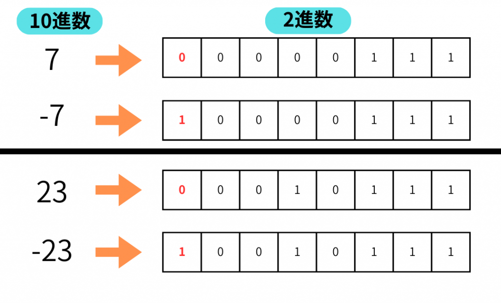 以下は10進数の「7」と「23」の正負を8ビットの2進数で表現した例となります。