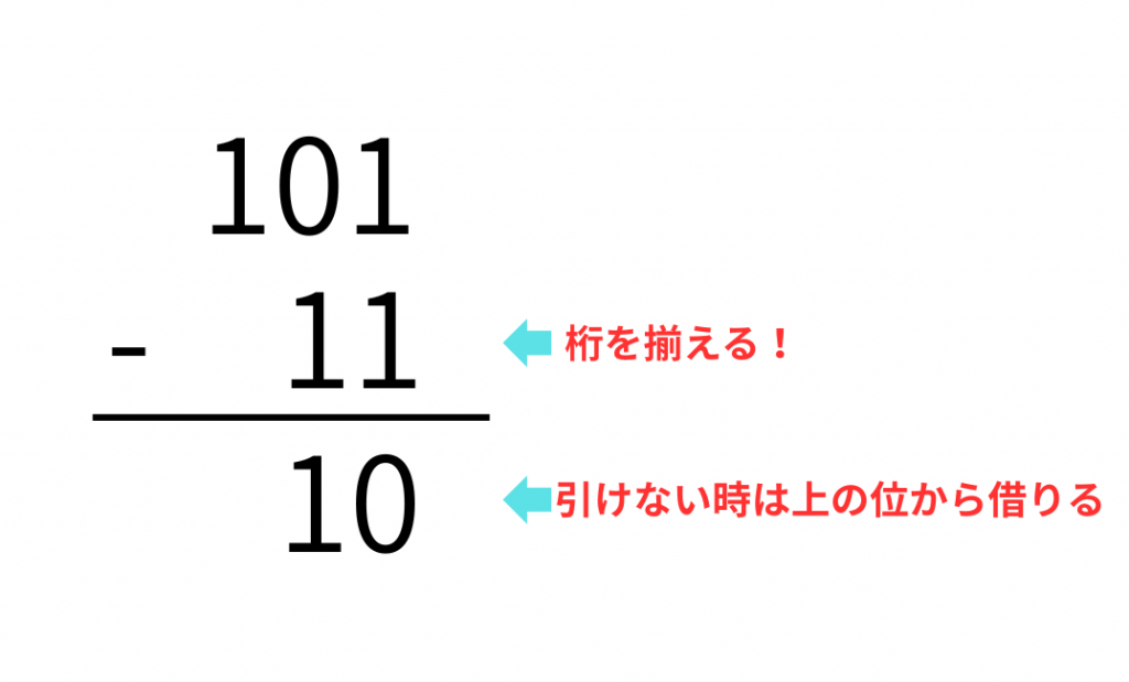 2進数の引き算も10進数の時同様に筆算をすることで求められます、桁をそろえて右の桁から計算を始めます。