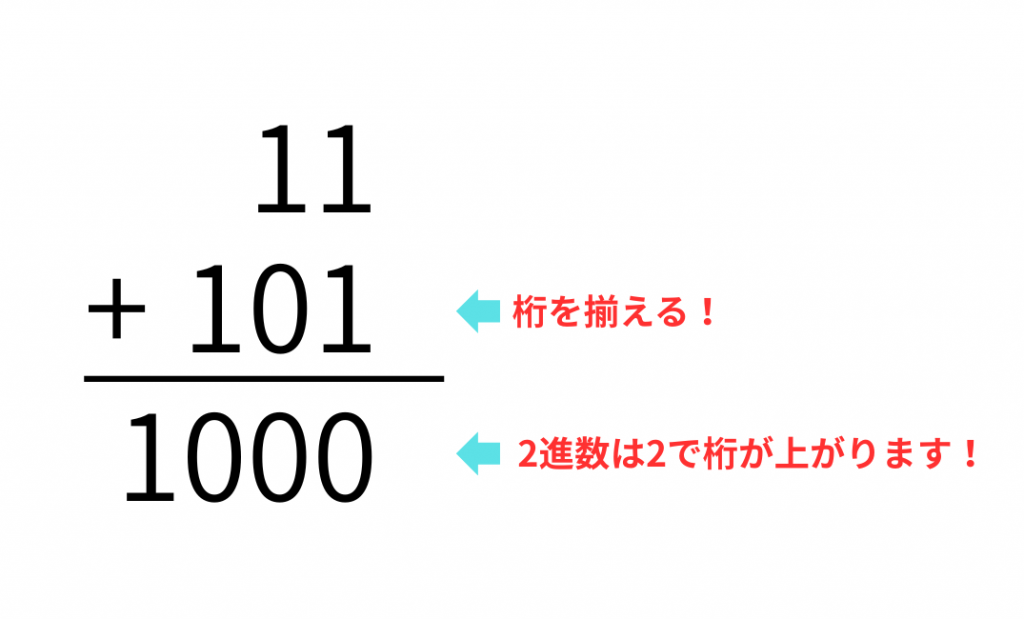 2進数のたし算は10進数の時同様に筆算をすることで求められます、桁をそろえて右の桁から計算を始めます。