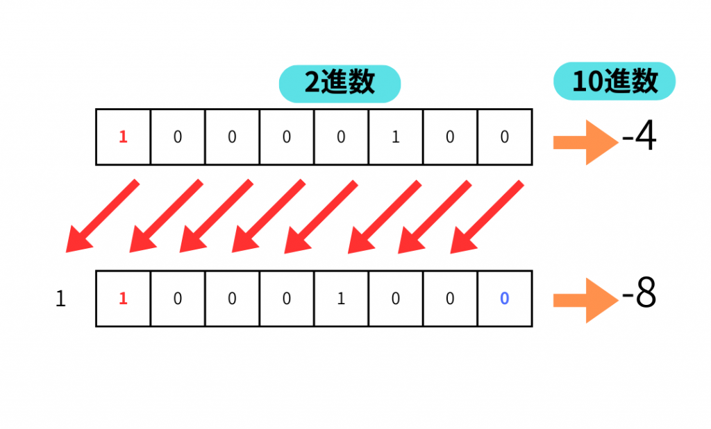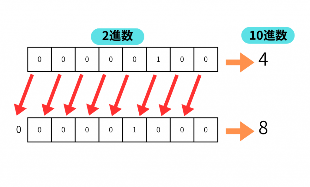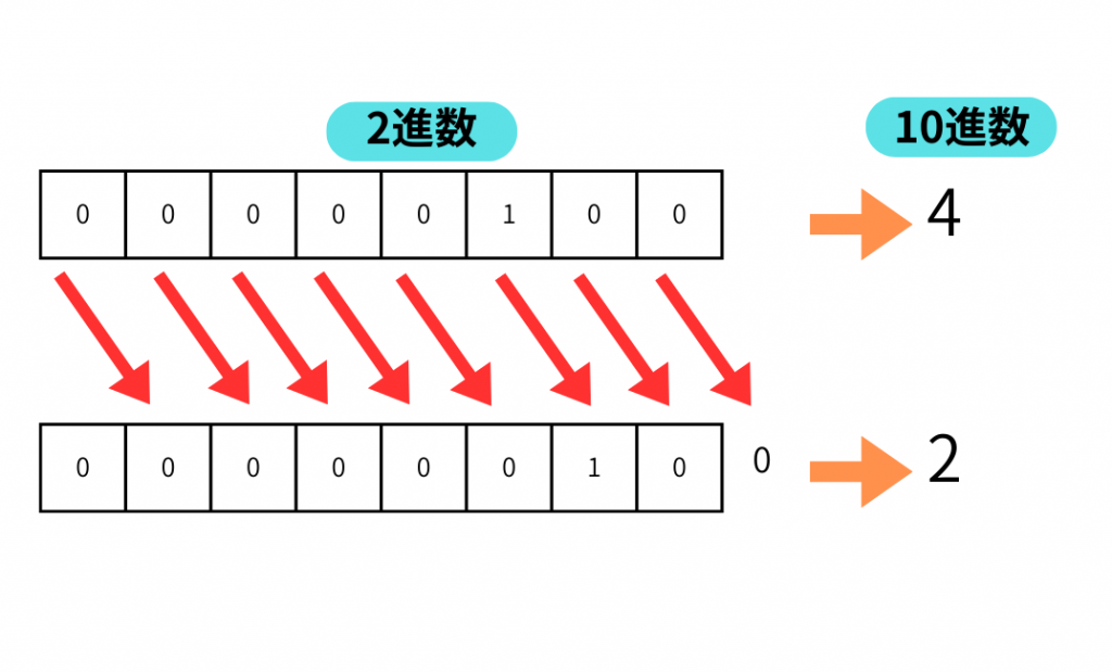 このことからビット列をn個左にずらすと元の数値の「2n倍」に、ビット列を右にずらすと元の数値の「2-n倍」になります。