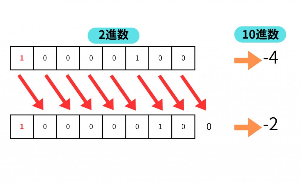 ・右方向にずらした場合、符号ビットと同じ数を挿入する