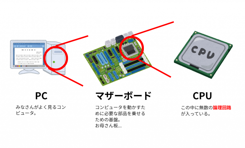 このCPUの中身を見ると、超々々々小さい電子回路でできています。そのなかに論理演算を行う電子部品として論理回路があります。CPUはこの無数にある論理回路を使用して演算を実施しています。