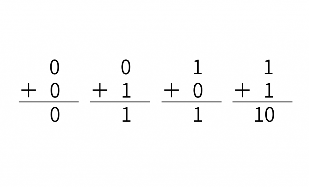 半加算器というのは、2進数のたし算で、下の位からの桁上がりを考慮しない加算回路のことを言います。2進数には「0」と「1」しか存在しないので2進数のたし算は以下の4パターンしか存在しないと言えます。