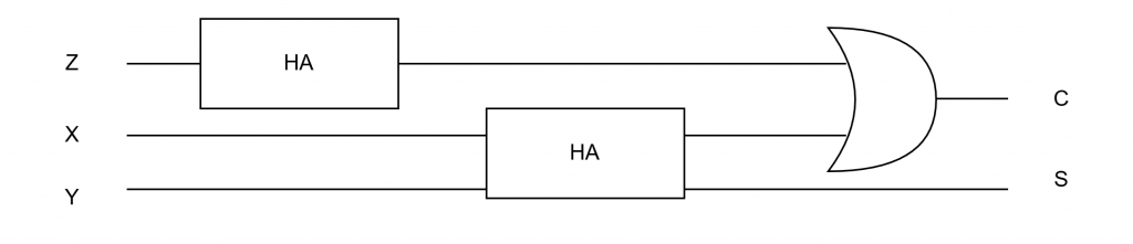 こちらの真理値表は2個の半加算器(HA:Harf Adder)と1個のOR回路(論理和)で実現可能です。