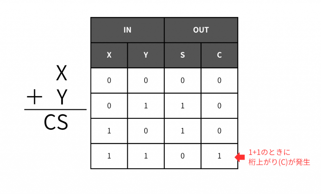 上記4つの演算を文字「X」「Y」「S」「C」を使用して真理値表に表してみましょう。ただし「X」「Y」は入力とし、「C」は桁上がり(Carry out)、「S」は和の一桁目の合計(Sum)を表現しています。