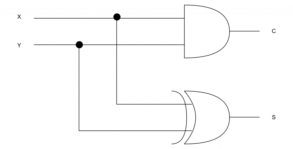 半加算器の真理値表はAND回路(論理積)とXOR回路(排他的論理和)の2種類の論理回路を組み合わせることで実現が可能です。