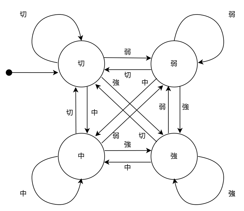 | 状態(現在)/入力 | 切ボタン押下 | 弱ボタン押下 | 中ボタン押下 | 強ボタン押下 |