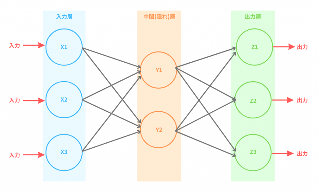 中間層(隠れ層):入力データの特徴を抽出・処理する層。多層化することでより複雑なパターンを学習できる。
